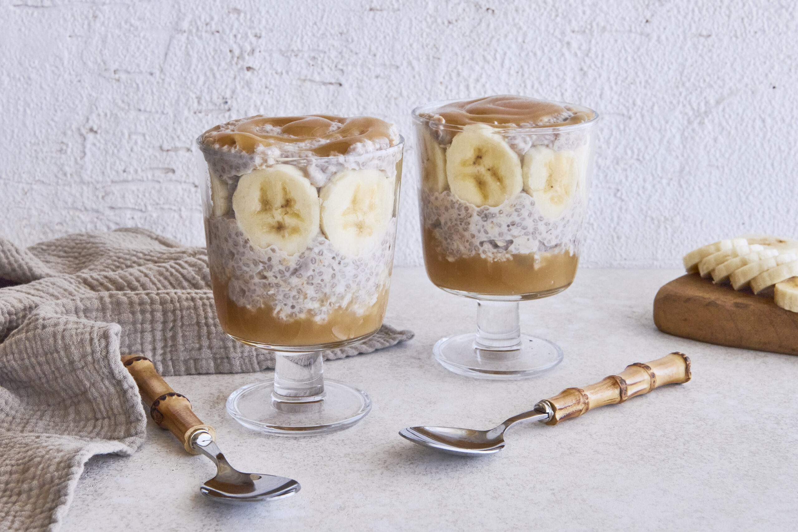 When ready to serve, add 1tbsp Dulce de Leche topping to the bottom of 2 serving glasses and turn so it coats the bottom 1/4. Top halfway with the oat mixture, then place a few banana slices around the edge of the glass and top with more oat mixture until the glass is 3/4 full. Serve with an extra drizzle of Dulce de Leche Topping.