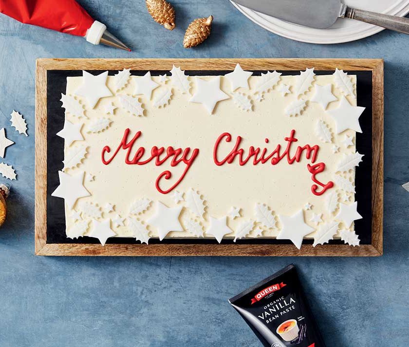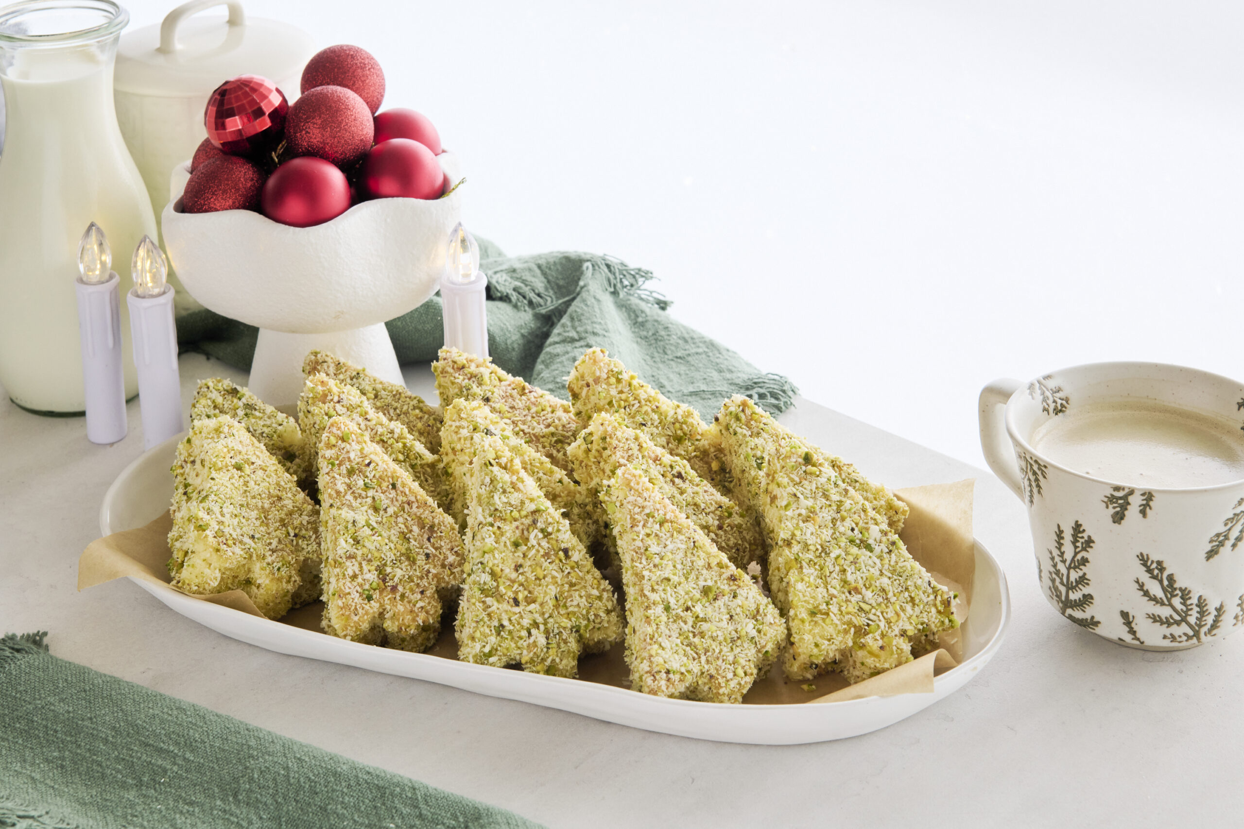 Pour desiccated coconut and ground pistachios onto a large shallow dish and set aside. When ready to assemble, chill cake in fridge for 15mins to firm it up and make it easier to handle. Use a 10x6cm tree shaped cookie cutter to cut 12-14 tree shapes from the vanilla cake.